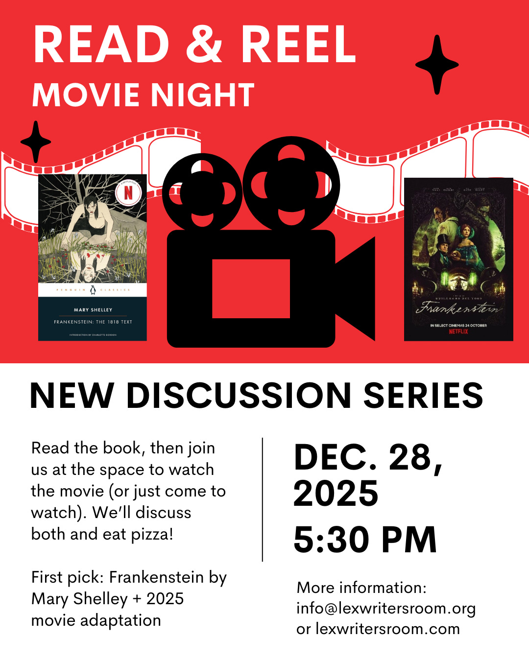 Now I’m alternating The Fire Concerto by Sarah Landenwich (LOVING) (Bookshop) and Frankenstein by, you know, Mary Shelley. The Frankenstein is for the first installment of this! The new book/movie club of mine and Josh Boldt’s dreams, kicking off next weekend at the Writer’s Room. If you’re in Lexington, join us for Read & Reel!